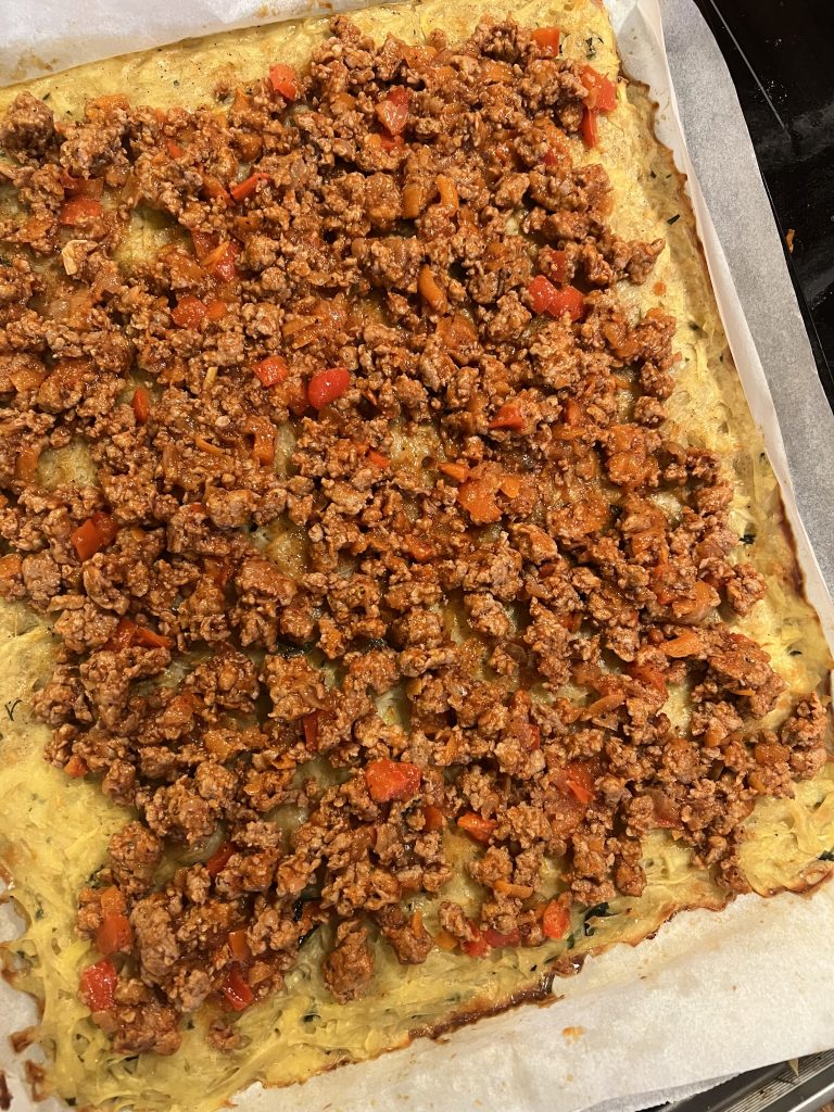 - За блата – Настържете картофите и кашкавала на едро ренде. Отцедете картофите много добре с ръце, след което ги смесете с половината от кашкавала, добавете яйцата и подправете със сол и пипер. Разпределете върху тава, застлана с хартия за печене (използвах плитката тава от самата фурна, която е 43х33 см.). Оформете правоъгълник като оставите по 2 пръста разстояние до края на хартията и изпечете в предварително загрята на 180 градуса фурна 30-40 мин., или до златен загар.